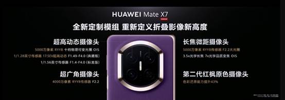 影像系统是Mate X7的一大亮点,该机配备了5000万像素RYYB十档物理可变光圈主摄、4000万像素RYYB超广角镜头(F2.2光圈)、5000万像素RYYB长焦微距以及第二代红枫原色摄像头。华为消费者业务CEO余承东在发布会上特别指出,第二代红枫原色摄像头配合折叠机最强感光主摄和长焦,使华为首次在轻薄折叠机上实现了直板旗舰的影像能力,并强调"华为Mate X7绝对对得起那四个字"。