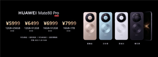 价格方面,Mate 80 12+256G版本售价4699元,12+512G版本售价5199元,16+512G版本售价5499元;Mate 80 Pro 12+256G版本售价5999元,12+512G版本售价6499元,16+512G版本售价6999元,16+1TB版本售价7999元;Mate 80 Pro Max 16+512G版本售价7999元,16+1TB版本售价8999元。(Suky)