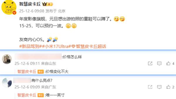 据知名数码博主@智慧皮卡丘 最新发布的信息显示,与此前曝光的消息基本一致,全新的小米17 Ultra影像旗舰有望元旦前发布。并且其透露,“15-25日可以预约一波”,或暗示新机在12月26日(周五)发布。而在与网友的互动中,该博主进一步透露,该机的一大亮点是搭载了“一英寸”主摄传感器,价格与前作变化不大。结合此前相关爆料,该机将配备的是OV50X主摄,这是豪威集团旗下的全新旗舰Sensor,拥有1英寸超级大底,像素尺寸是1.6微米,拥有双模拟增益(DAG)HDR和传感器内裁切变焦功能,最高支持8K视频录制。并且还搭载LOFIC技术,可以让拍摄场景中的高光信息更好地被传感器保留下来,不容易出现过曝情况。