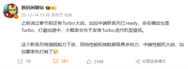 其他方面,根据此前曝光的消息,全新的一加Turbo新机将搭载骁龙8s Gen4特调版芯片,该芯片采用4nm制程工艺,搭载“1超7大”的全大核CPU架构,支持旗舰同款165Hz高刷新率。相比前代平台,CPU性能提升高达31%,同时能效进一步优化,为高性能场景下的续航表现提供保障。此外,新机电池容量有望达到9000mAh级别,在正常使用场景下,一天出门无需再携带充电宝。值得一提的是,知名数码博主@数码闲聊站 也进一步透露,该系列将实现旗舰能力下放,在同档位中,性能与续航都极具杀伤力,一加将率先打响中端性能机大战。