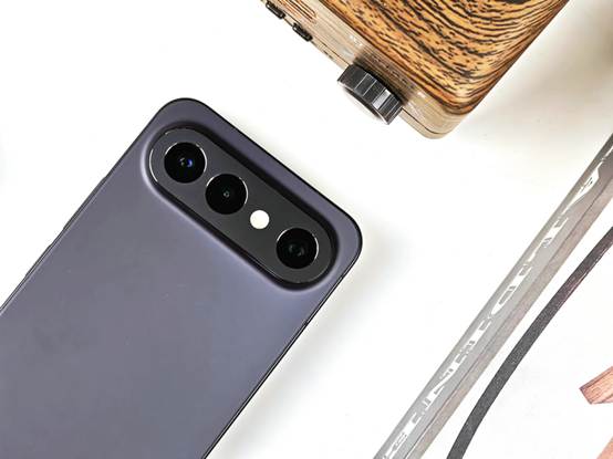 如果说屏幕是理性的一面,那么背部就是vivo S50系列感性表达的舞台。此次我们拿到的是vivo S50 Pro mini的“深空黑”配色版本,采用了缎面柔光玻璃,触感如丝缎般顺滑,且不易沾染指纹——即便刚涂完护手霜拿起手机,也不会留下油腻痕迹。