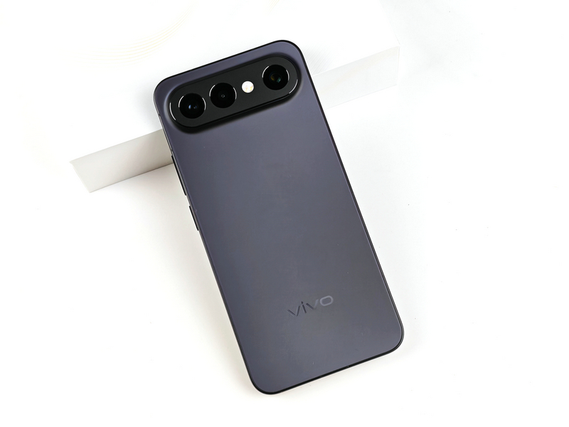 如果说屏幕是理性的一面,那么背部就是vivo S50系列感性表达的舞台。此次我们拿到的是vivo S50 Pro mini的“深空黑”配色版本,采用了缎面柔光玻璃,触感如丝缎般顺滑,且不易沾染指纹——即便刚涂完护手霜拿起手机,也不会留下油腻痕迹。