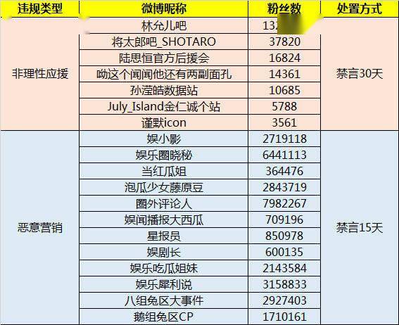 2.对7个非理性应援账号予以删除违规微博,禁言30天的处置。(具体见配图)