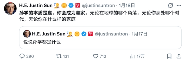就连孙宇晨本人也亲自下场。他在社交平台写道:“孙学的本质是赢,你会成为赢家,无论在地球的哪个角落,无论你身处哪个时代,无论你在什么样的家庭。”