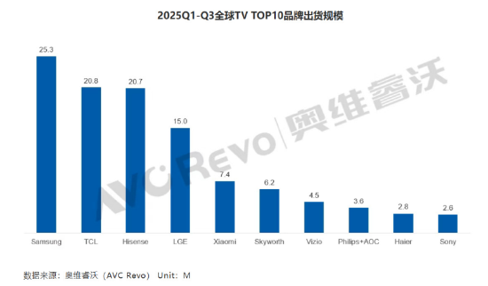 据市场研究机构奥维睿沃发布的《全球TV品牌出货月度数据报告》显示,2025年前三季度,索尼电视的出货量为260万台,排名第十位,落后于TCL、海信、小米、创维、海尔一众中国品牌。