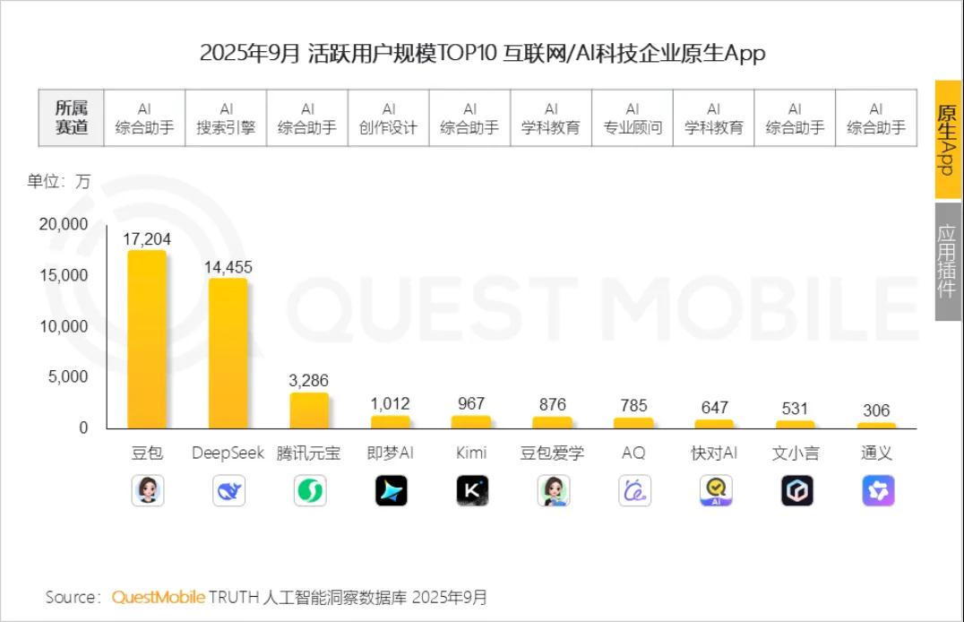 但随着月之暗面暂缓投流,用户也开始持续流失。QuesMobile数据显示,2025年9月,Kimi的月活规模仅为967万,而豆包和Deepseek则已经破亿,两者的量级差距被迅速拉开。