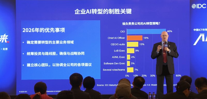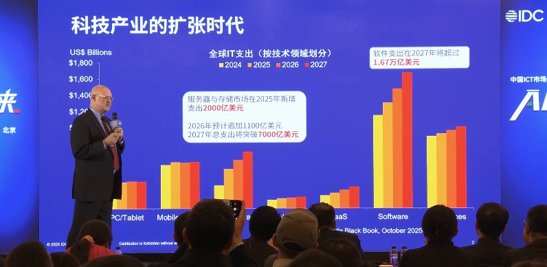 12月3日消息,在IDC FutureScape 2026:中国ICT市场预测论坛上,IDC全球研究集团副总裁Rick Villars发表题为《迈向智能新纪元:重塑全球IT产业的三大驱动力》的主旨演讲。