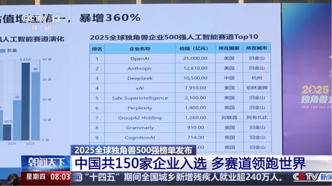 12月5日消息,据央视新闻报道,2025全球独角兽企业500强榜单正式发布,中国共有150家企业入选,在数量和估值占比上继续保持全球领先。