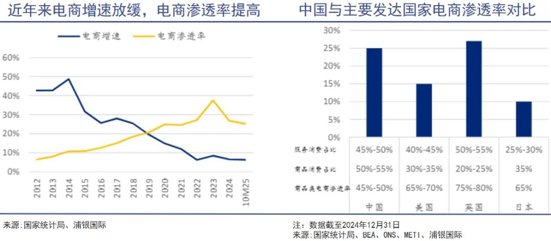 国家统计局的数据显示,1-10月我国实物商品网上零售额增长6.3%,增速较前几年有了明显的放缓,占社会消费品零售总额的比重为25.2%。国际间横向比较看,中国电商总渗透率达到25%,大幅高于美国日本等发达国家。