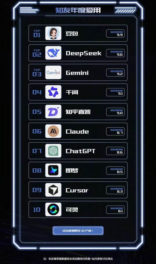其中,豆包、DeepSeek、Gemini、千问、知乎直答、Claude、ChatGPT、即梦、Cursor、可灵,成为此次“知友年度爱用”产品榜前十。Gemini、ChatGPT、Claude则跻身年度爱用的海外产品。