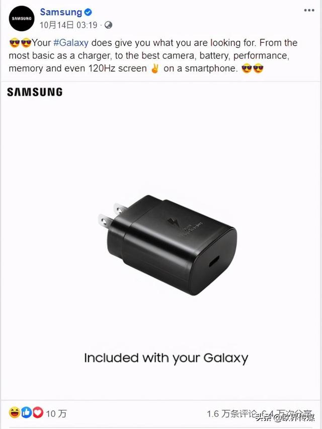 据外媒MacRumors报道,三星在其社交媒体账户上嘲讽苹果从iPhone 12系列和其他iPhone型号中移除充电器,指出三星Galaxy智能手机在出货时将继续配备充电器。 “这些将包括在你的Galaxy中,”三星Facebook的帖子中写道,并配上了一张充电器的图片。