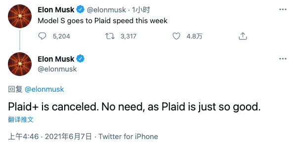 马斯克宣布取消加强版 Model S Plaid + 车型:Plaid 已经足够好