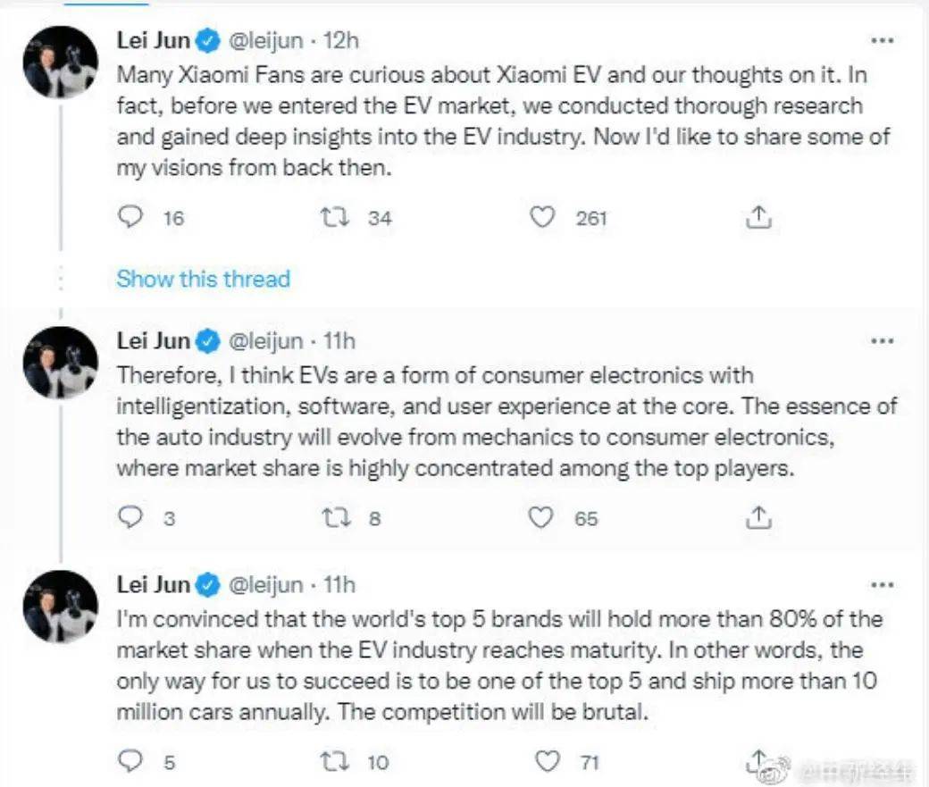 10月19日,雷军在社交媒体表示,“我相信,当电动汽车行业成熟时,世界前五大品牌将占据80%以上的市场份额。换言之,我们成功的唯一途径是成为前五名之一,每年出货量超过1000万辆,竞争将是残酷的。”