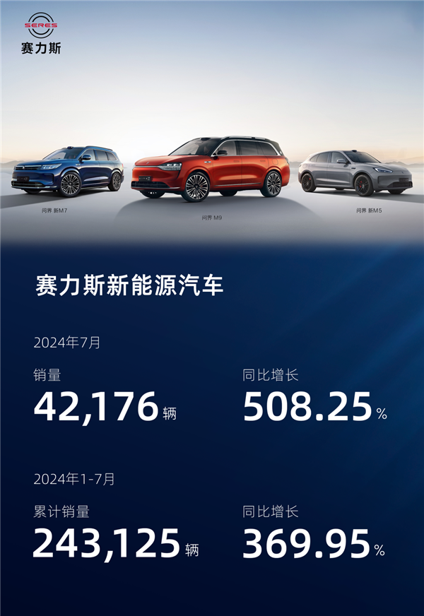 8月1日消息,赛力斯集团发布了7月产销快报,数据显示,赛力斯新能源汽车(快科技注:主要是问界)7月销量达42176辆,同比增长508.25%;今年1-7月赛力斯新能源汽车累计销量达243125辆,同比增长369.95%。