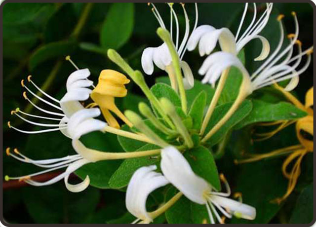 金银花属多年生半常绿缠绕及匍匐茎的灌木。小枝细长,中空,藤为褐色至赤褐色。卵形叶子对生,枝叶均密生柔毛和腺毛。夏季开花,苞片叶状,唇形花有淡香,外面有柔毛和腺毛,雄蕊和花柱均伸出花冠,花成对生于叶腋,花色初为白色,渐变为黄色,黄白相映,球形浆果,熟时黑色。