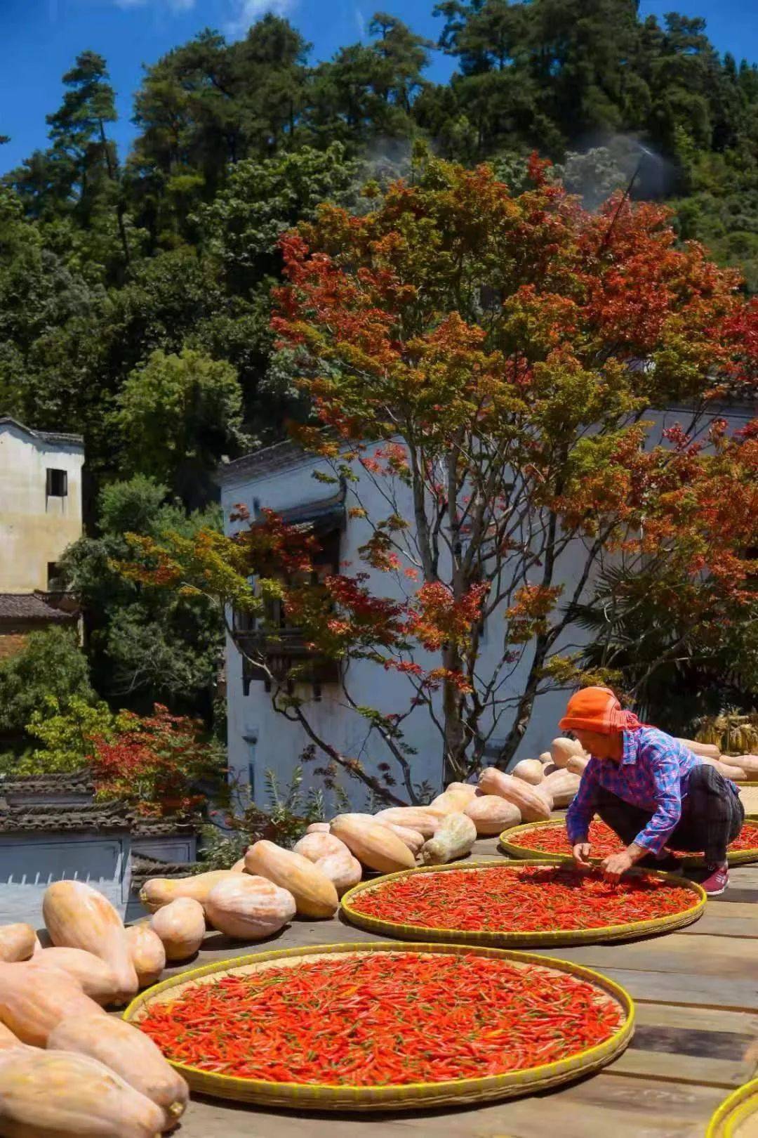 “晒秋”是婺源县篁岭人一直传承的秋收习俗.人们在这个季节会把收获的粮食、辣椒、筝干等进行晾晒。从空中望去,在这座古村落里,大大小小的晒匾,犹如五彩斑斓的画作。