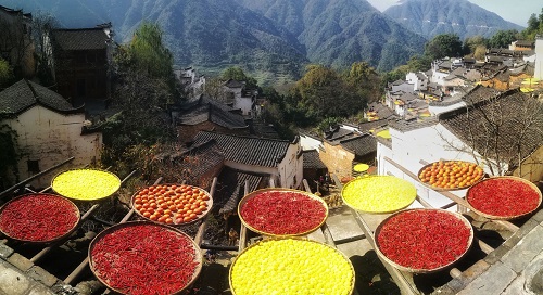 答案:丰收的农作物,晒秋是一种典型的农俗现象,具有极强的地域特色。生活在山区的村民,由于地势复杂,村庄平地极少,只好利用房前屋后及自家窗台、屋顶架晒或挂晒农作物,久而久之就演变成一种传统农俗现象。“秋”指丰收的农作物和果实。其实晾晒这种农俗现象,并非秋季“专属”,一年四季都有展示,只不过秋季丰收季节,表现得更为丰富、更为“神韵”些罢了。