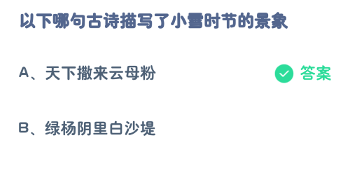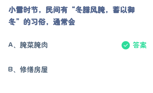 蚂蚁庄园11.22日问题为以下哪句古诗描写了小雪时节的景象和小雪时节民间有冬腊风腌蓄以御冬的习俗通常会,蚂蚁庄园11.22日答案为天下撒来云母粉和腌菜腌肉,两个问题都是关于小雪时节的问题,具体解析在这篇2023蚂蚁庄园今日答案11.22最新汇总。