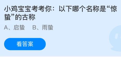小鸡宝宝考考你:以下哪个名称是“惊蛰”的古称?启蛰还是雨蛰?这是2025年蚂蚁庄园3月5日庄园小课堂的问题,下面为大家详细介绍2025年3月5日今天蚂蚁庄园课堂小鸡饲料答案。